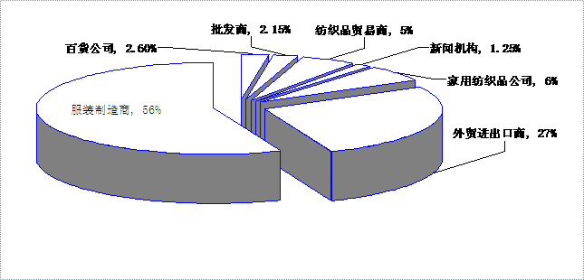 B觀眾方面:“CTITE2011”博覽會連續三天的展出以來。共吸引了33218(不完全統計)名業內買家入場參觀。其中服裝制造商和外貿進出口公司占到了全場的83%(比例如圖:)
