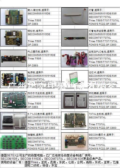 在這里,您會找到最全面的德國SETEX原廠配件,而且大多數都是現貨供應. 德國SETEX公司生產的染整電腦,已廣泛地被各染整設備制造廠使用。 SECOM 505,SECOM 515,SECOM 515DE,SECOM 737XL(早期型號:SC737XL),SECOM 535更是經典產品。 使用該系列產品的設備廠有:德國第斯,亞機,昆南,東武,立信,合同,高勛,東成,亞蔡,藝煌,邵陽二紡機,楊佳,東寶… … 一.電腦 SECOM505,( Thies T505 ),SECOM515,SECOM515DE, GFC883,SECOM535 及配件 1.主板 2.電源板 3.顯示屏 4.按鍵板 5.PLC插卡 6.模擬板 7.輸入/輸出板 8.燈管 9.燈管電源逆變器 10.主板及PLC板電池 二.電腦 SECOM737XL(早期型號:SC737XL),( Thies T737 ,T737XL , Fong'S FC22 )及配件 1.主板 2.通訊卡 其它737XL配件與515的通用. 三. Logimat P160 PLC及配件 1.外殼(含底板) 2.電源板 3.CPU板 4.模擬板(主) 5.模擬板(擴展) 6.輸入板 7.輸出板 四. CR8 , CR16 PLC ( FMD12A,FMD16A, FMD24A, FMD32A, DIOSM32 )及配件 1.外殼(含底板) 2.電源板 2.CPU板 3.模擬板 4.輸入板 5.輸出板 6.通訊板 五. FMD系列PLC ( FMD 12A,FMD 16A, FMD 24A, FMD 32A,DIOS M32 )及配件