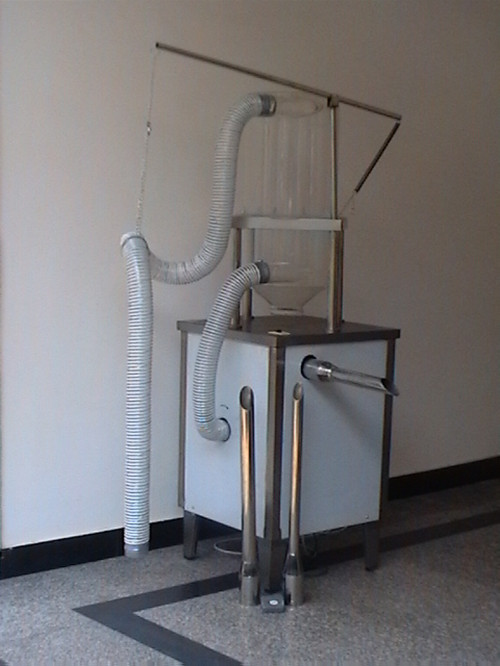 | 1.1本設備是用高壓風機吸取羽絨,充灌被褥的小型機械。 1.2 電動機功率:1.1KW,電源電壓:220V。風壓:大于3.5千帕 1.3風機帶電磁內剎車:可以在斷電2秒內風機停止出絨。保持產品和場地整潔,羽絨損耗小。適用商場一個工人操作。不推薦工廠長時間使用。 1.4 本機設計時綜合日、德等國充絨機優點,風機采用電機直聯,重量輕,結構簡單故障少,安裝使用維修方便。獲得中國專利號。 1.5風葉大、風力大,充毛片也不易堵塞。葉輪經精確平衡調試,中等轉速,鑲嵌橡皮腳,噪音小、無振動。 1.6充絨管直徑:32毫米 , 51毫米。用硬接頭充絨管,阻力小、方便快捷。在商店可以用柔軟接頭充絨管,轉彎靈活,在狹小場地也能操作。 1.7 采用全不銹鋼外殼,豪華、大方、整潔、經久耐用。 1.8 透明的有機玻璃羽絨旋風過濾桶,底部有強力磁鐵,可以在充絨過程中去除羽絨中的部分大的雜質和鐵屑。給顧客看到蓬松、優質的羽絨。 1.9 另外選用電子稱來計量羽絨,工人手持軟管吸取電子秤上的羽絨,同時觀看重量的變化,抬高吸絨管就可停止吸絨。人工可以控制精確度在2克以內。我們的機械不能自動控制羽絨的填充重量。 1.10 有全套抗靜電、接地線。彈簧吊桿懸掛吸絨軟管,可以減輕充絨工人勞動強度。 1.11 整機體積:長×寬×高=0.52×0.52×1.8米,凈重50公斤, 木箱體積:主機 0.55×0.55×1.6米,毛重80公斤, 配件箱 0.68×0.58×0.97 毛重23公斤。