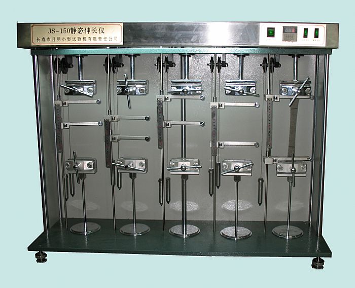 JS-105型 靜態伸長儀 靜態伸長儀是我廠最新研制的對織物、橡膠、塑料等測試靜態伸長試驗的儀器。它的主要特點是結構簡單,牢固耐用,經濟實惠。工作原理是將織物、橡膠、塑料等被測試樣夾在上夾具和下夾具之間,在配上所需的牽引力的砝碼,在一定的時間內所測得的被測試樣的伸長變形與被測試樣的原始間距之比即為靜態伸長率。可參照示意圖進行橡膠、塑料、汽車、客車等的裝飾、裝修材料的試驗,是生產廠家和質檢部門不可缺少的試驗儀器。 主要技術參數: 1.最大夾持寬度: