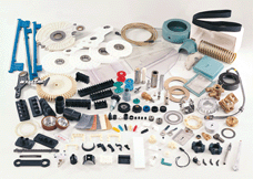 導絲嘴(兔子頭)、轉盤、T型滑桿、滑座、止捻輪、轉盤剎車片、滑座、儲氣槽組、用升絲桿滑座、導絲嘴滑塊、聯軸器、搓捻皮圈、羅拉皮圈、皮壓輥組、磁導、龍帶漲緊輪、皮圈羅拉、切向皮帶導輪、網絡噴嘴用母接頭、假捻器等