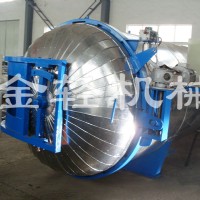 我公司生產的真空定型快速蒸紗鍋適用于以天然纖維、化學纖維為原料的紡織行業和單位,其主要用途是將具備織造條件的連續的絲線在合并、加捻后進行定型,即用于化纖、真絲、羊絨、紗線、窗簾、起皺布、印花布等的定型。即在一定壓力溫度下穩定捻度,獲得均衡的不扭縮絲線,便于后道工序的加工和提高產品質量。對于強捻度的紗線,采用“蒸箱”定型顯得更為重要。 該“蒸箱”的使用特點是:適用范圍廣泛,既能濕熱定型(將飽和蒸汽直接通入筒體內),又能干熱定型(將飽和蒸汽通入夾套內,由筒體內壁散熱)。大門開關輕便,物體裝卸迅速,密封性能好,熱定型效率高,使用安全可靠。定型后的產品諸如強力伸長度等物理機械性能不受影響,保證了產品的質量。